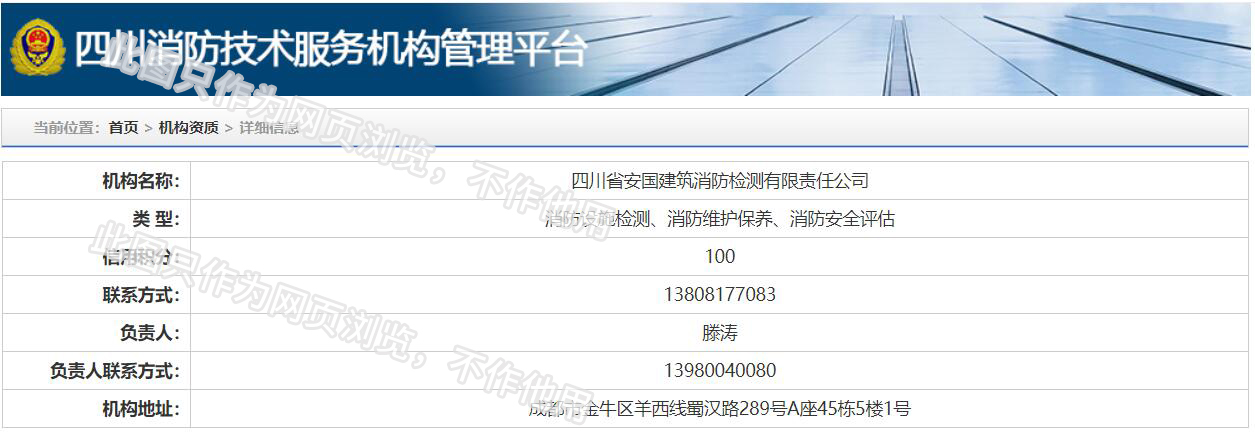 四川省安國建筑消防檢測有限責任公司,成立于1998年,經四川省公安消防總隊批準,工商部門注冊的獨立法人單位。 公司具有建筑消防設施檢測、電氣防火安全檢測、維修、保養及技術咨詢一級資質的中介技術服務機構,獲得CMA計量認證。主要業務范圍是:接受建設單位或有關單位委托,承擔新建、改建、擴建建筑自動消防設施技術檢測、電氣防火安全檢測、以及承接建筑消防設施維護保養,對已交付使用的建設消防設施的運行情況進行運行檢測,開展建筑消防設施的消防安全技術咨詢。公司設辦公室、總工辦、財務部、檢測部、維保部等職能機構,擁有一